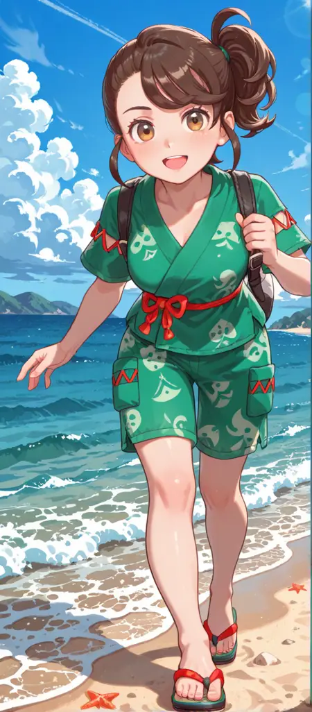 collarbone, jinbei \(clothes\), japanese clothes, short sleeves, green shirt, print shirt, green shorts, print shorts, pocket, sandals