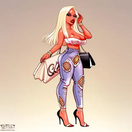(tube top,bra straps,riped denim pants,heels) (wristbands)(collarbone,navel)(shoulder purse)