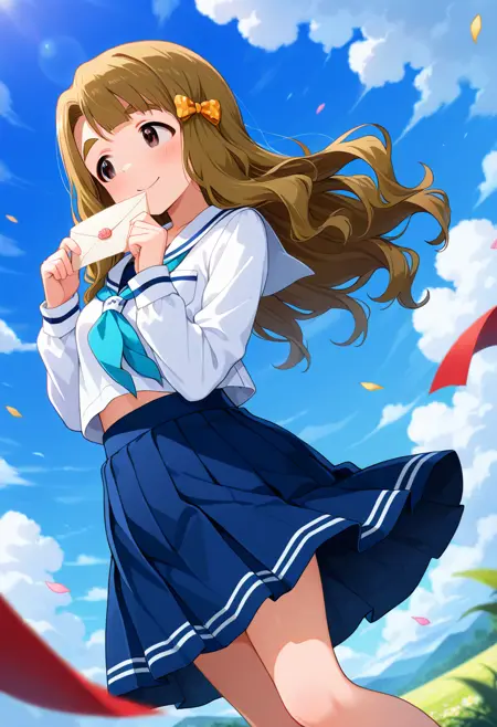 miyao miya, sailor dreamer, long hair, brown hair, wavy hair, blunt bangs, asymmetrical bangs, sidelocks, thick eyebrows, eyebrows visible through hair, brown eyes, school uniform, serafuku, white shirt, white blouse, blue skirt, pleated skirt, blue neckwear, blue neckerchief, white sailor collar, hair bow, hair ribbon, hair ornament, yellow bow, long sleeves, polka dot bow, breast pocket, black legwear, loafers, brown footwear