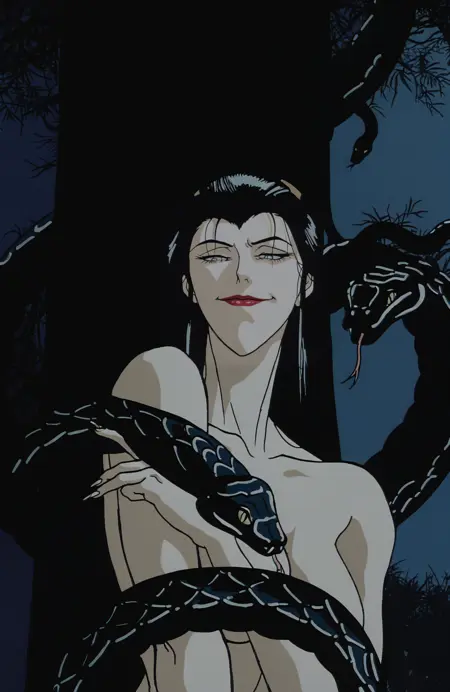 Benisato(《忍者杀手》),1个女孩,妆容,红唇,微笑,邪恶微笑,蛇,黑发,头发向后梳,