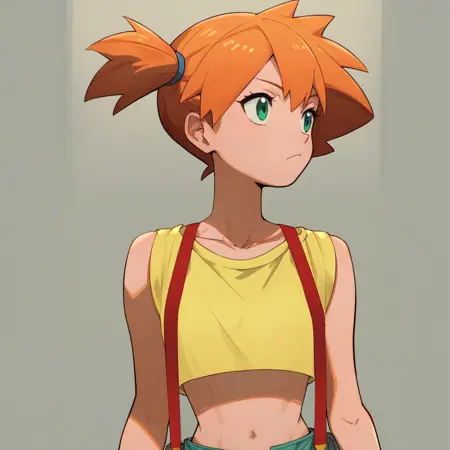 m1sty, orange hair, short hair, side ponytail, green eyes,bare arms, suspenders, navel, midriff, yellow shirt, collarbone, crop top, sleeveless shirt, denim shorts,solo