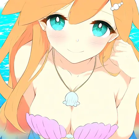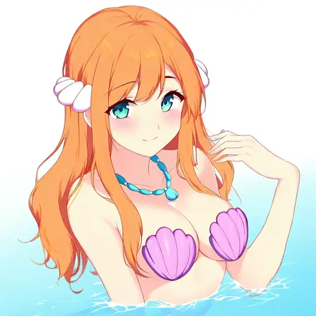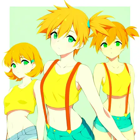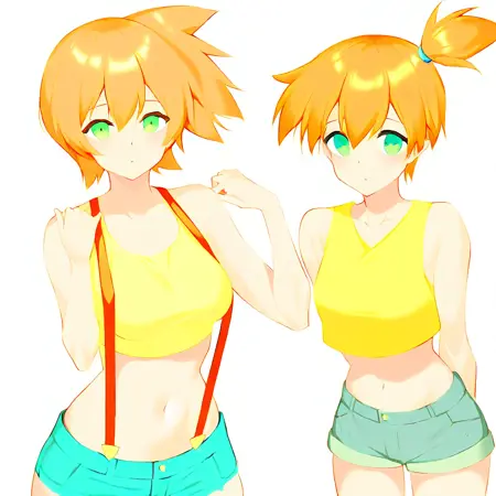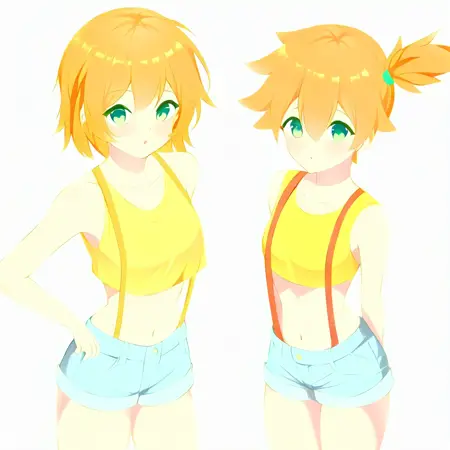 m1sty, orange hair, short hair, side ponytail, green eyes,bare arms, suspenders, navel, midriff, yellow shirt, collarbone, crop top, sleeveless shirt, denim shorts,solo