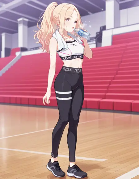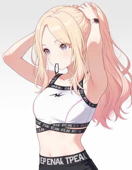 포니테일, 스포츠웨어, 쇄골, 옷에 쓰인 글자, 흰색 스포츠 브라, 시계, 복부, 배꼽, 요가 팬츠, 검은 스니커즈