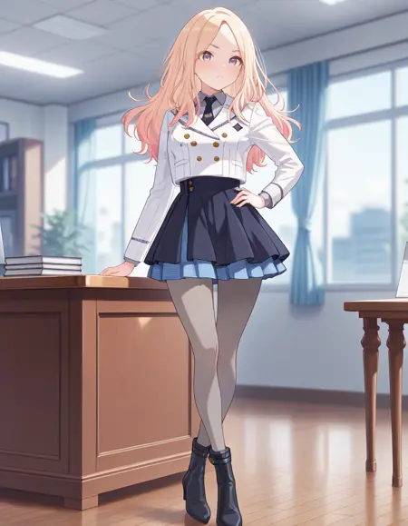 교복, 흰색 자켓, 더블 버튼, 회색 칼라 셔츠, 검은 타이, 긴 소매, 주름 치마, 층층이 된 치마, 체크 치마, 회색 팬티스타킹, 하이힐 부츠