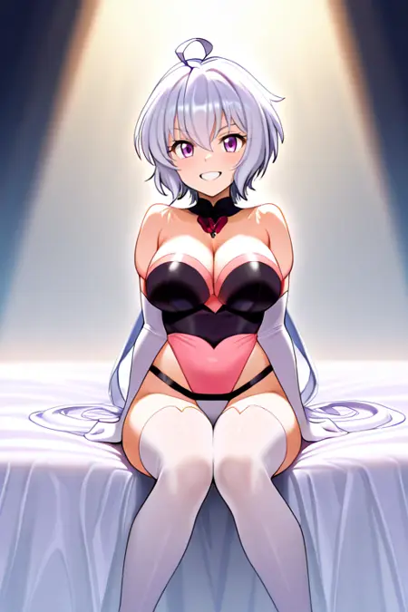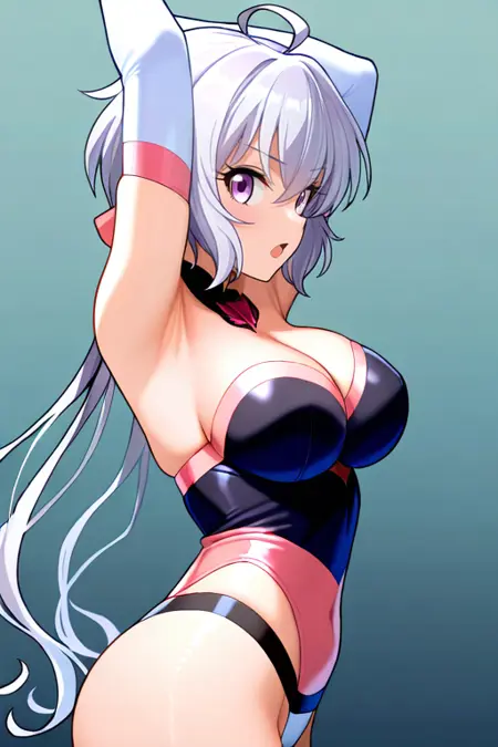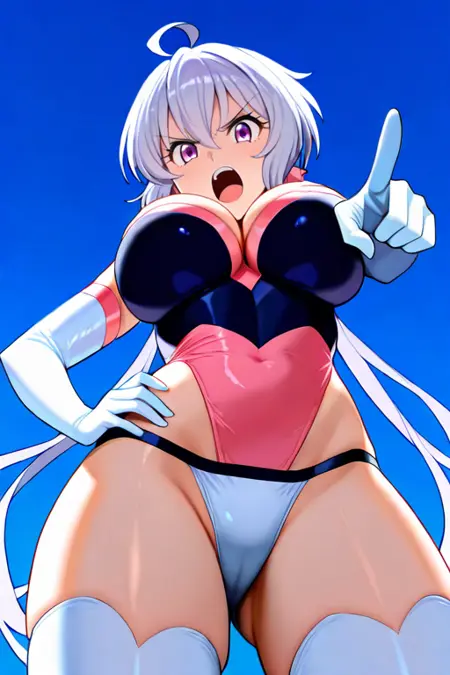 大きな胸、chrisdef、レオタード、ピンクのレオタード、谷間、肘まで手袋、白い手袋、白い太ももまで丈の靴下、体にぴったりフィット、