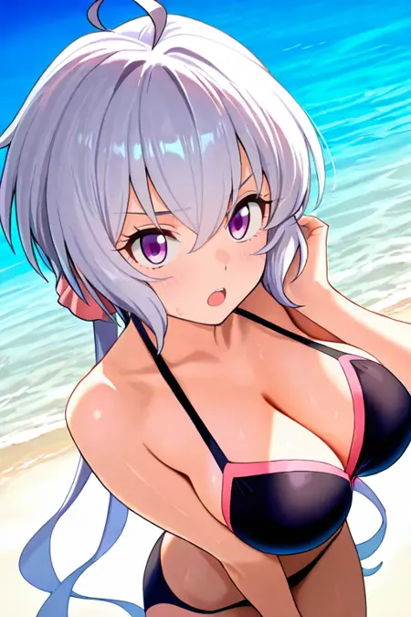 1人女の子、単体、ゆきね・クリス、ツインテール、低めのツインテール、白髪、アホ毛、額に髪が掛かっている、purple eyes、