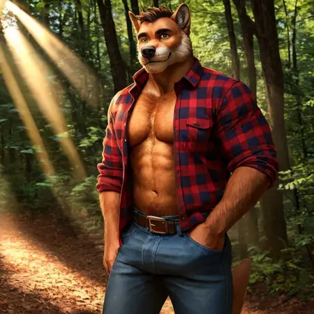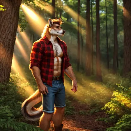 긍정 태그: 여름 낮, 숲 한가운데에서 햇빛이 나무 잎 사이로 쏟아져 내리는 상황에서, 벌거숭이 가슴을 드러낸 채 열린 데님 셔츠를 입고 긴 털이 많은 꼬리를 가진 앤트로 남성, 목수 스타일