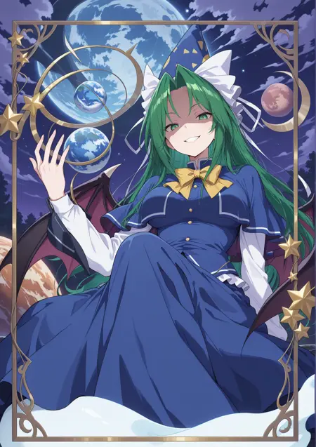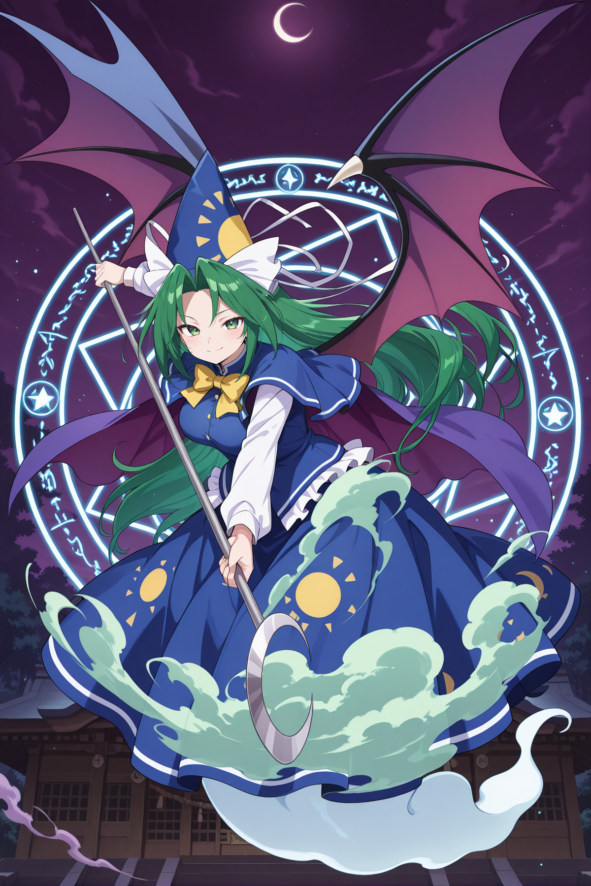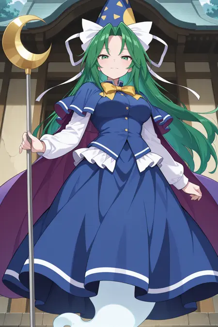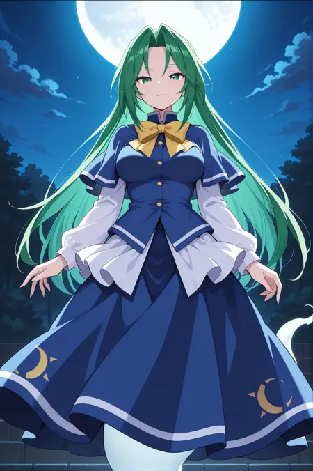 mima, 1girl, solo, green eyes, green hair, long hair, medium breasts,