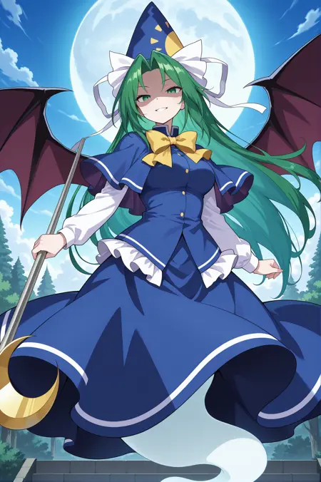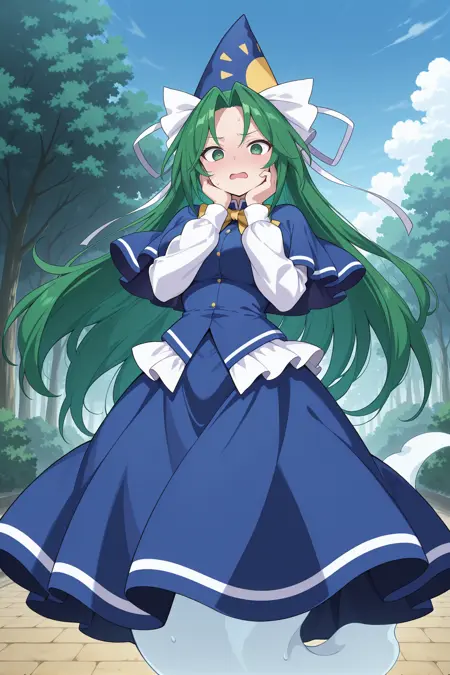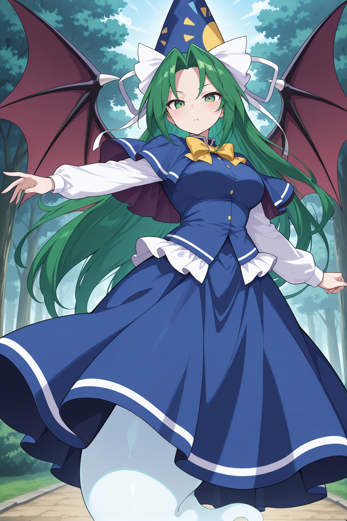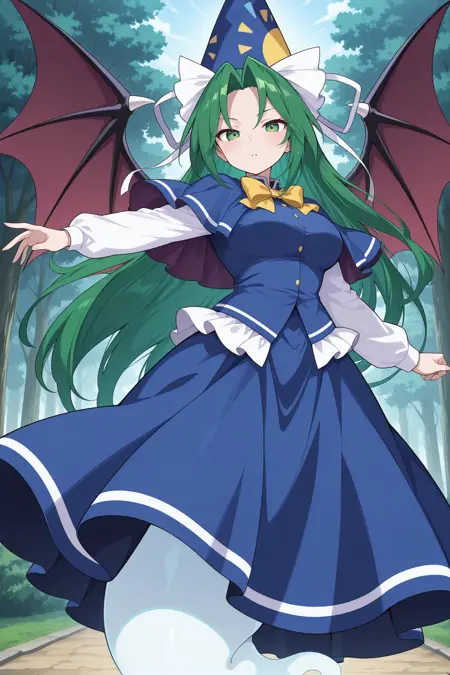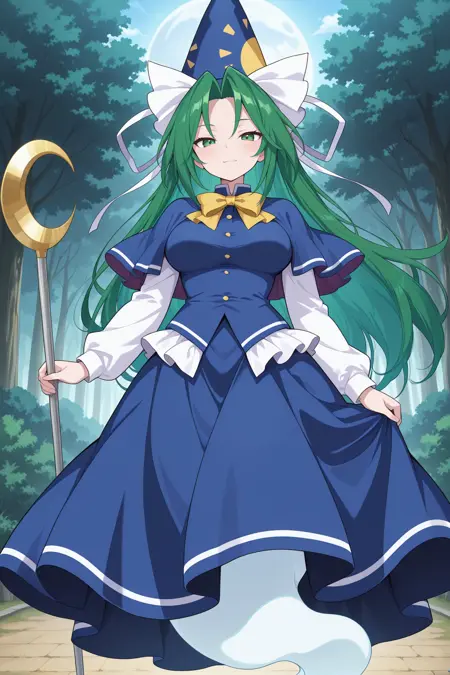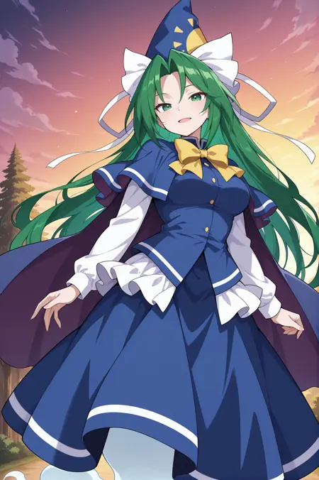 wizard hat, blue capelet, yellow bow, blue dress, white sleeves, long sleeves, blue skirt, ghost tail,