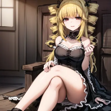 | 학습된 단어 | a drawing of an anime character dressed in black sitting on a floor, 1girl, solo, blonde hair, crossed legs, drill hair, red eyes, wine, dress, sitting, smille,복사됨! a beautiful blonde woman dressed in black holding umbrella in her hand, 1girl, blonde hair, dress, bat (animal), red eyes, umbrella, vampire, solo, gloves, drill hair, long hair, black dress, black umbrella, outdoors, city background,복사됨! |