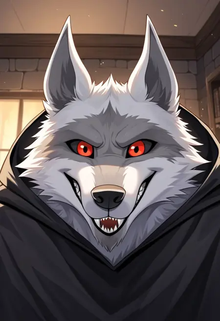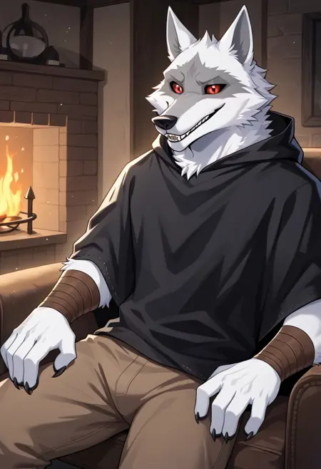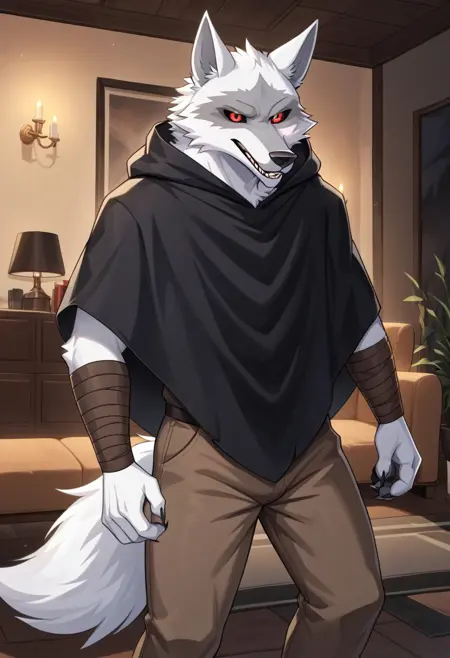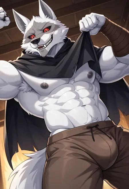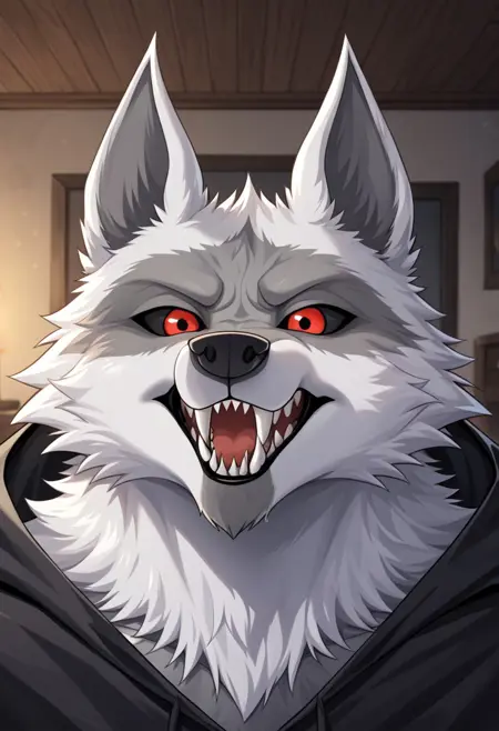 Anthro,Deathwolf, Wolf, Black Sclera, Red Eyes, white fur,sharp teeth,wolf ears