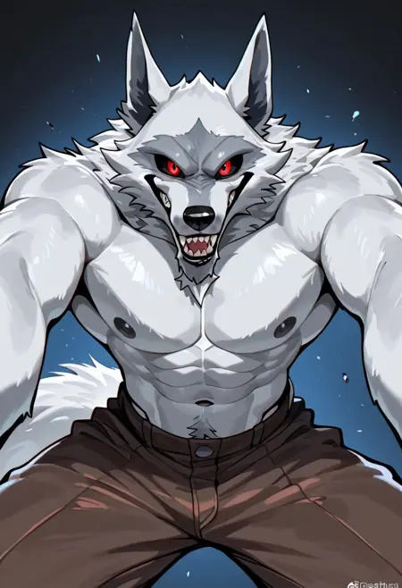 Anthro,Deathwolf, Wolf, Black Sclera, Red Eyes, white fur,sharp teeth,wolf ears,