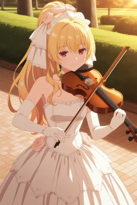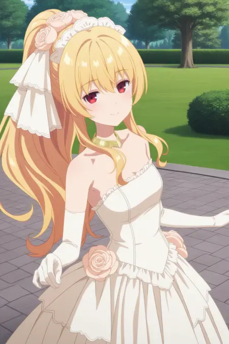 bbyue, red eyes, blonde hair, high ponytail, hair ornament, hair flower, choker, white dress, strapless dress, elbow gloves, white gloves, anime coloring,
