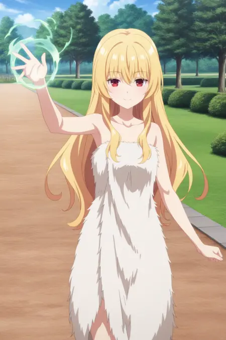 aayue, red eyes, blonde hair, collarbone, armpits, bare shoulders, bare arms, fur cloak, anime coloring,