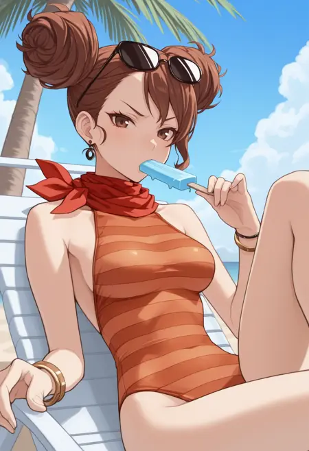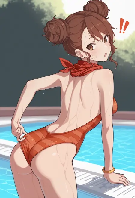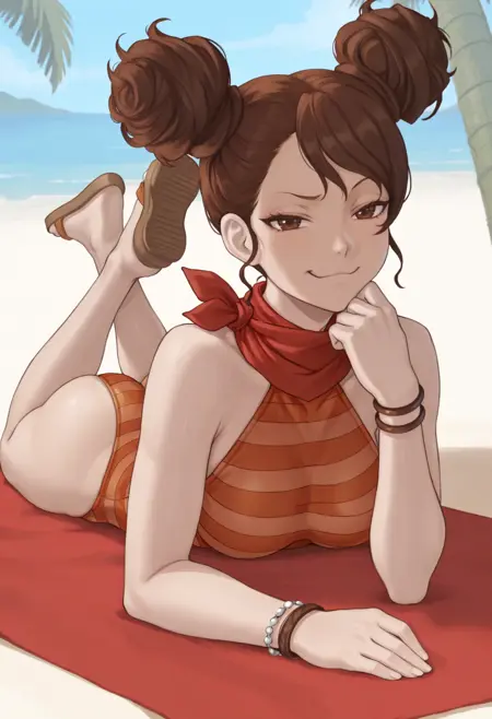 Swimsuit appearance: sumR0s, brown hair, double bun, brown eyes, earrings, red scarf, orange one-piece swimsuit, striped one-piece swimsuit, bracelet