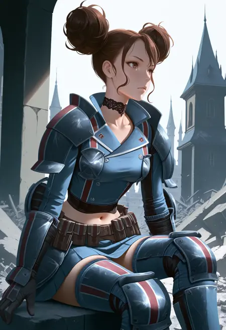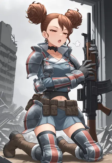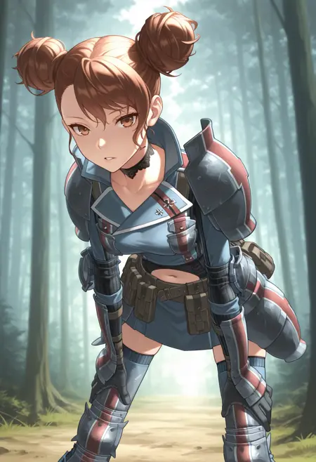 Default appearance: dfR0s, brown hair, double bun, brown eyes, earrings, black choker, lace choker, military uniform, armor, shoulder armor, elbow pads, black gloves, navel cutout, belt, belt pouch, blue skirt, thighhighs, knee pads, brown boots