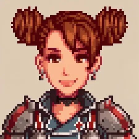 기본 외모: dfR0s, 갈색 머리카락, 더블 버니, 갈색 눈, 귀걸이, 검은 초커, 레이스 초커, 군복, 갑옷, 어깨 보호대, 팔꿈치 패드, 검은 장갑, 배꼽 절개, 벨트, 벨트 주머니, 파란 치마, 허벅지 긴 양말, 무릎 보호대, 갈색 부츠