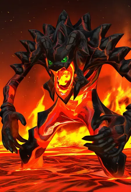 Iblis, magma creature, lava, rock skin, green eyes, horns