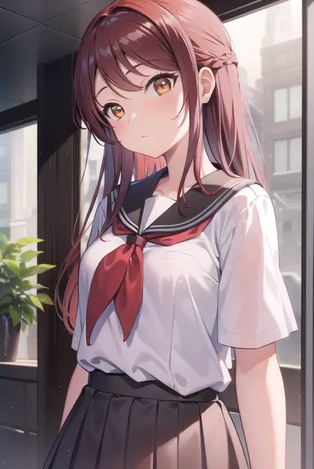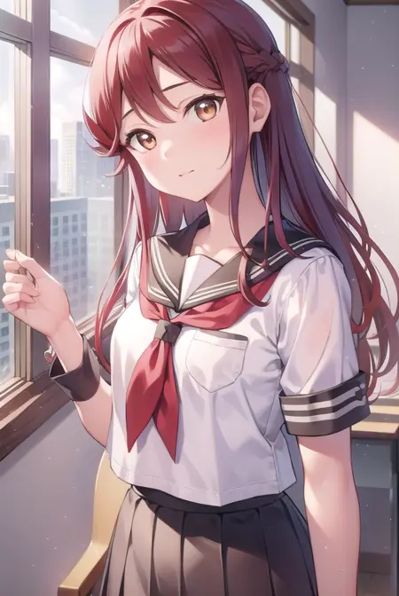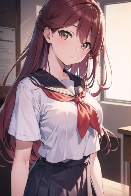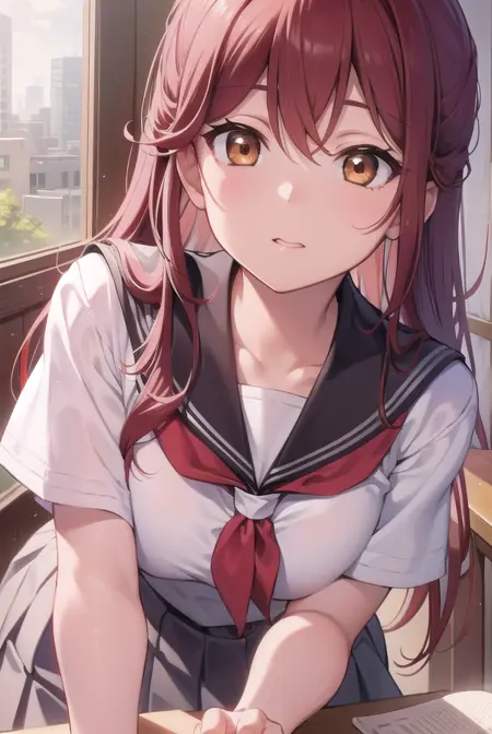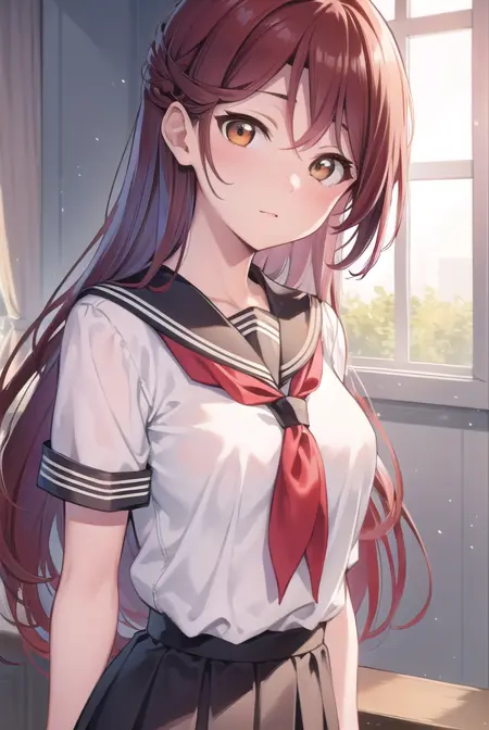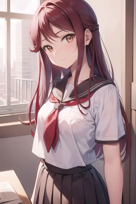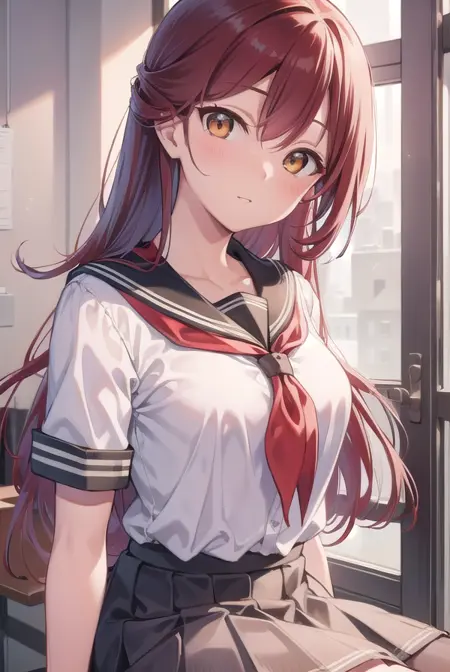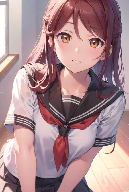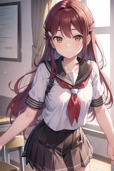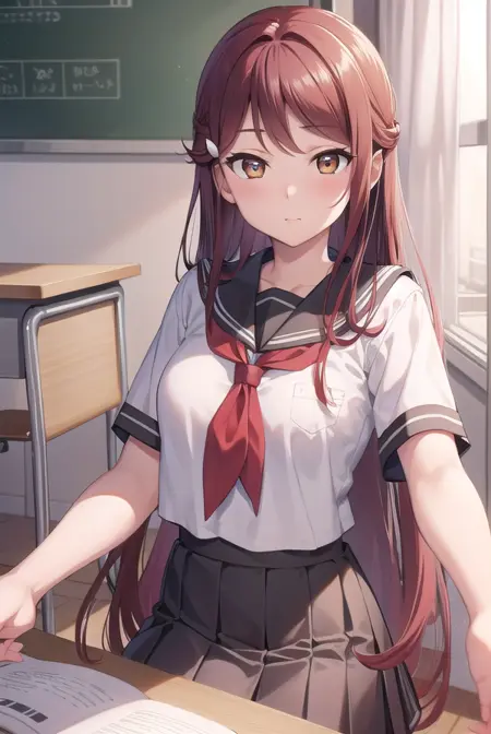 riko sakurauchi, (brown eyes:1.5), hair between eyes, long hair, (red hair:1.5),