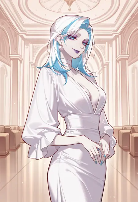 服装2(礼服)标签: vesperdress,白色连衣裙,项圈,耳环,胸脯,乳房,蓝色指甲,白色高跟鞋,