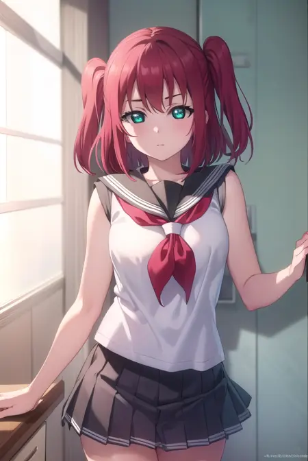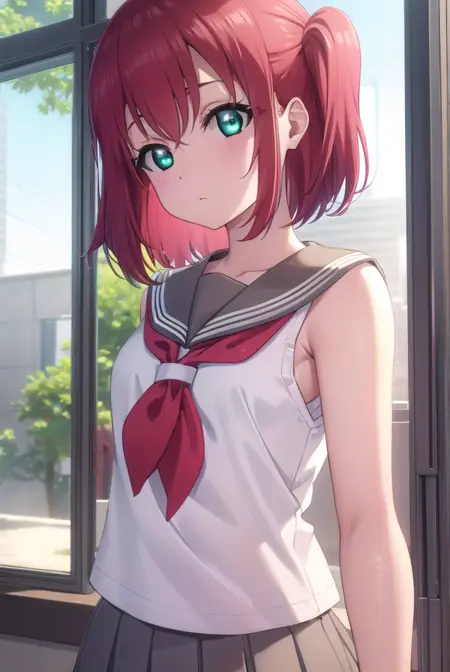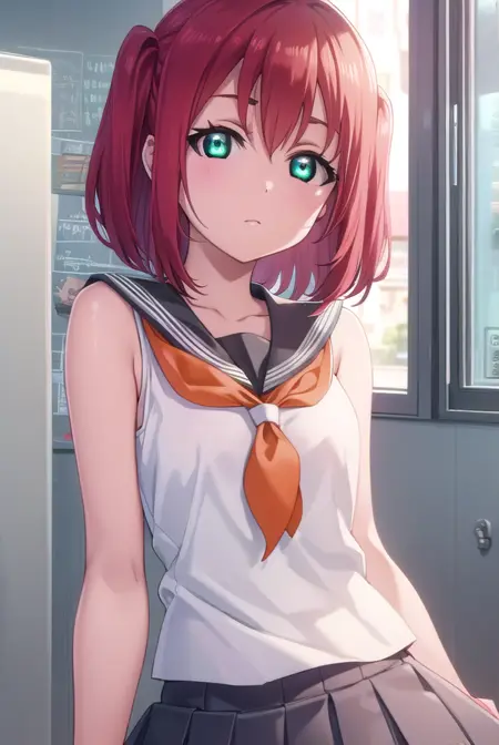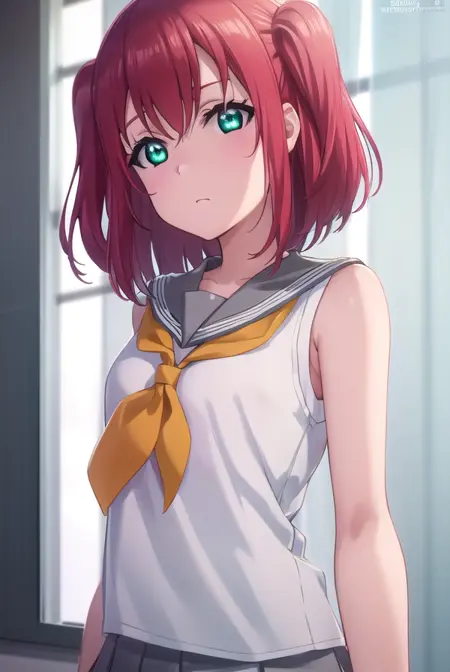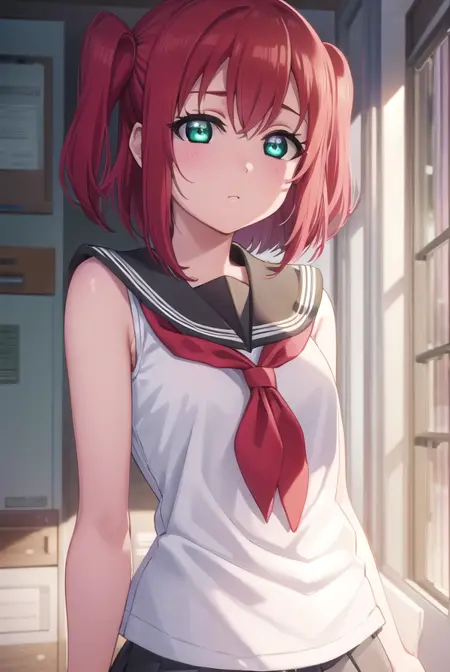 ruby kurosawa、ショートヘア、前髪、(緑の目:1.3)、赤髪、水色の目、サイドアップ、
