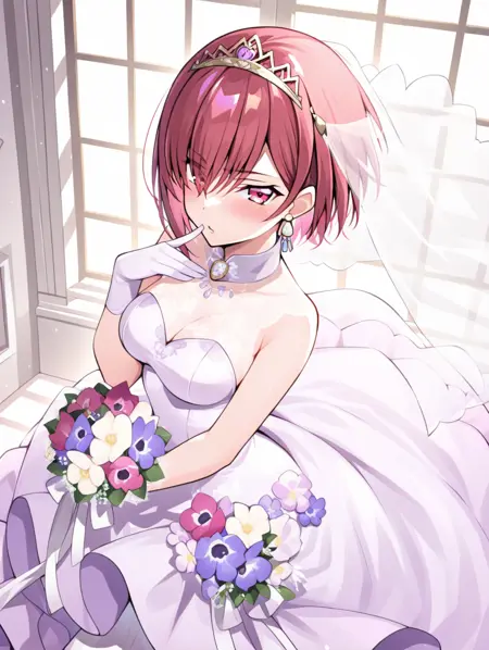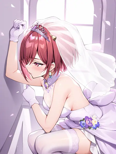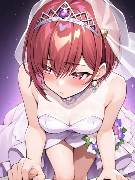 プロンプト例: hanayome,red hair,short hair,bridal veil,purple wedding dress,lace trim,sleeveless,tiara,solo,red eyes,