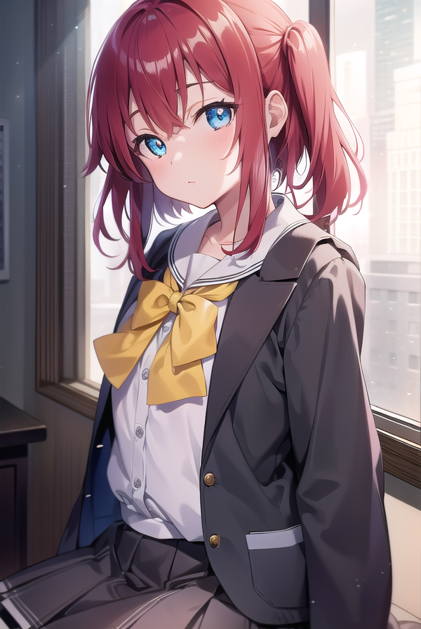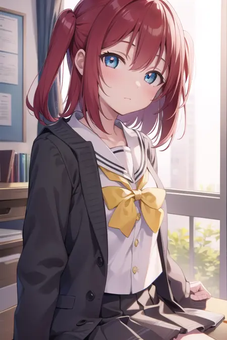 ruby kurosawa, short hair, bangs, (green eyes:1.3), red hair, aqua eyes, two side up,