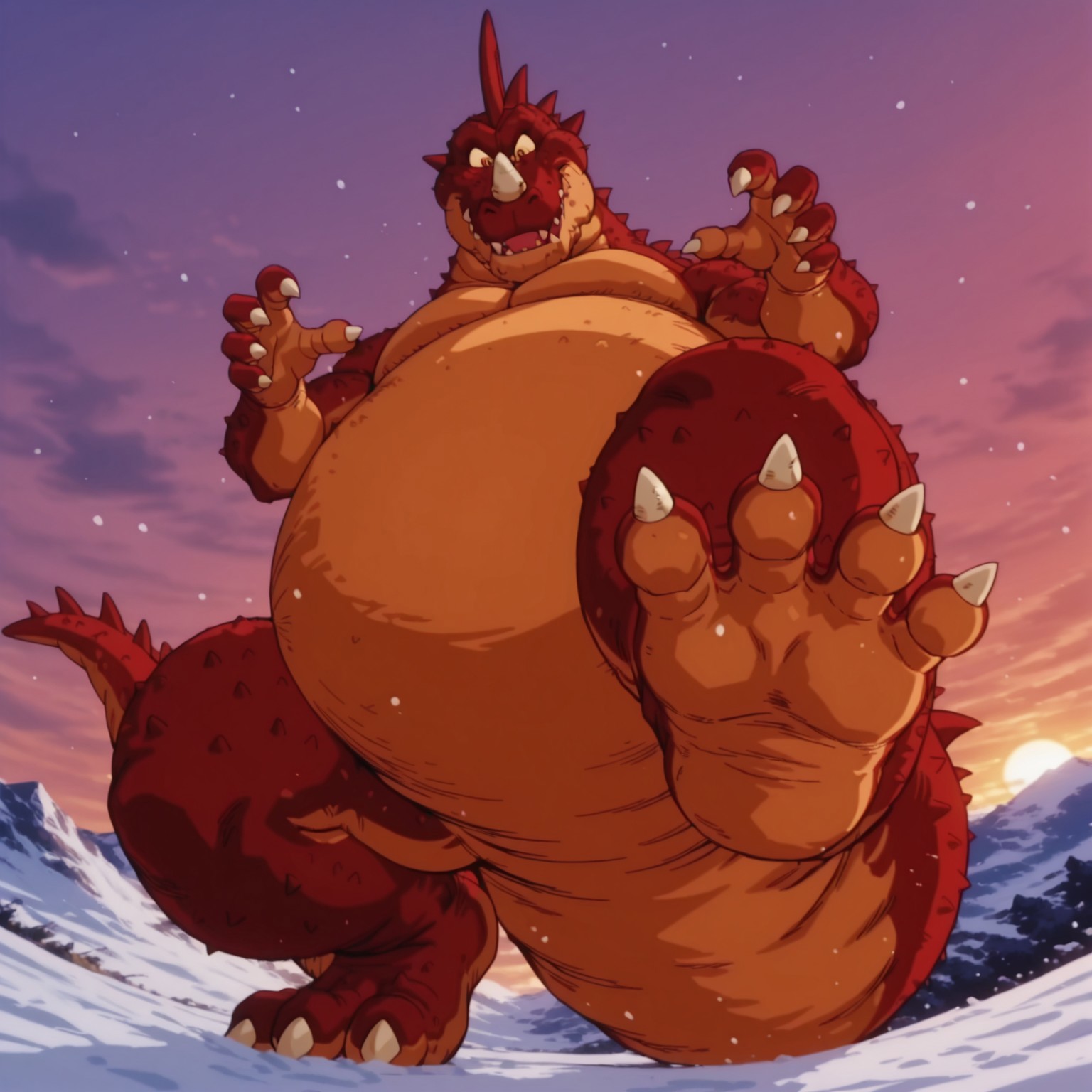 Tags: dinosaur, scalie, red skin, tan skin, tan countershade torso, two tone skin, orange eyes, claws, toe claws, spikes, tail, tail spikes, horn, sharp teeth, fangs, fat,