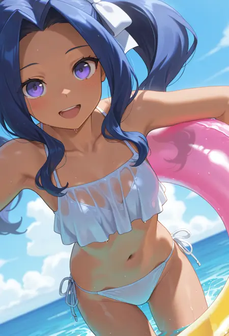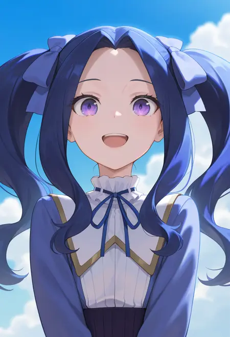 彼女の外見に関するタグ: 1girl, solo, long hair, ribbon, twintails, blue hair, purple eyes, hair intakes, blue ribbon, hair bow