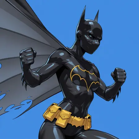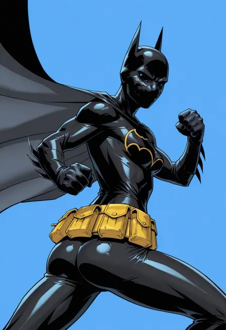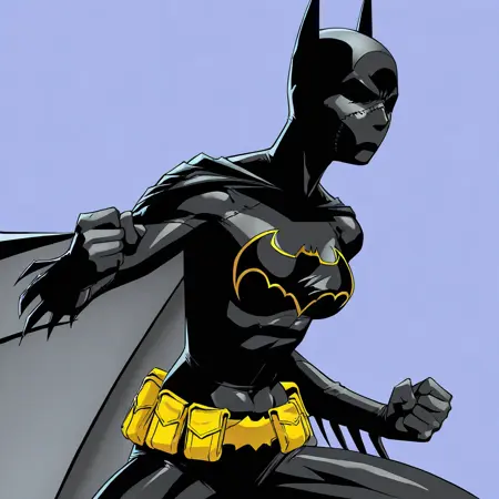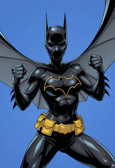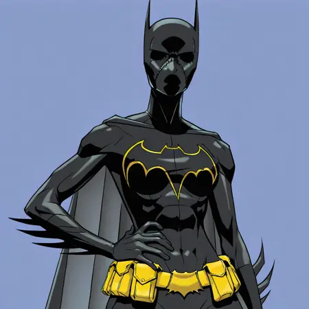 1girl, solo, DC Comics, Batgirl, BlackBat, toned female, black mask, black sclera, no pupils, covered face, black bodysuit, black cape, utility belt, yellow belt, insignia, bat symbol,