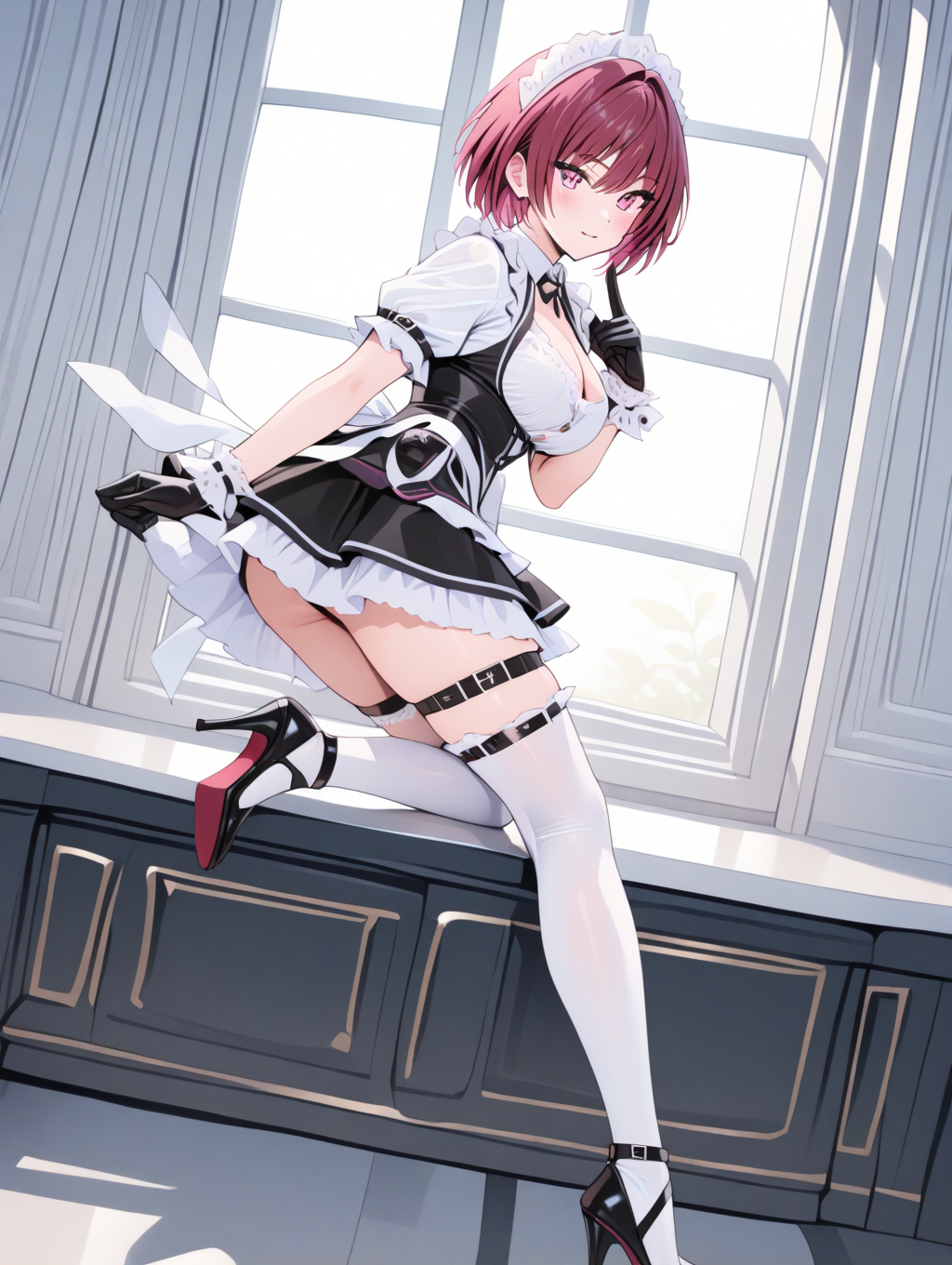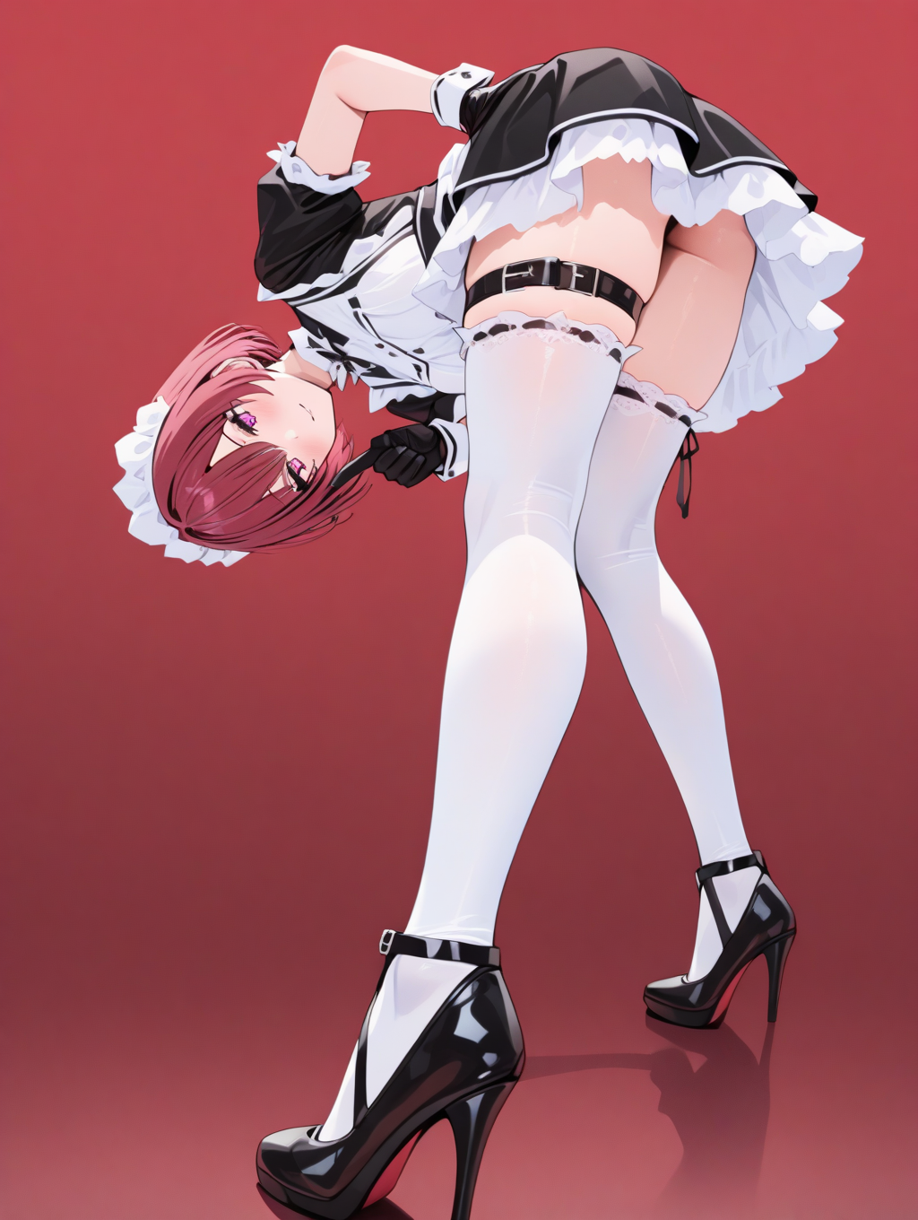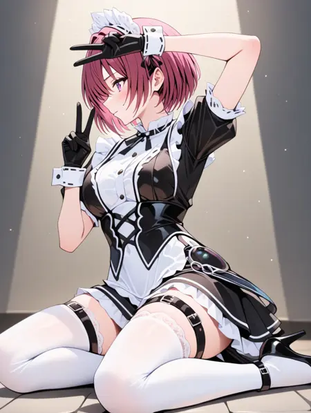 프롬프트 예시: meido,maid,maid headdress,gloves,cuffs,puffy short sleeves,frilled miniskirt,thigh belt,thighhighs,high heels,