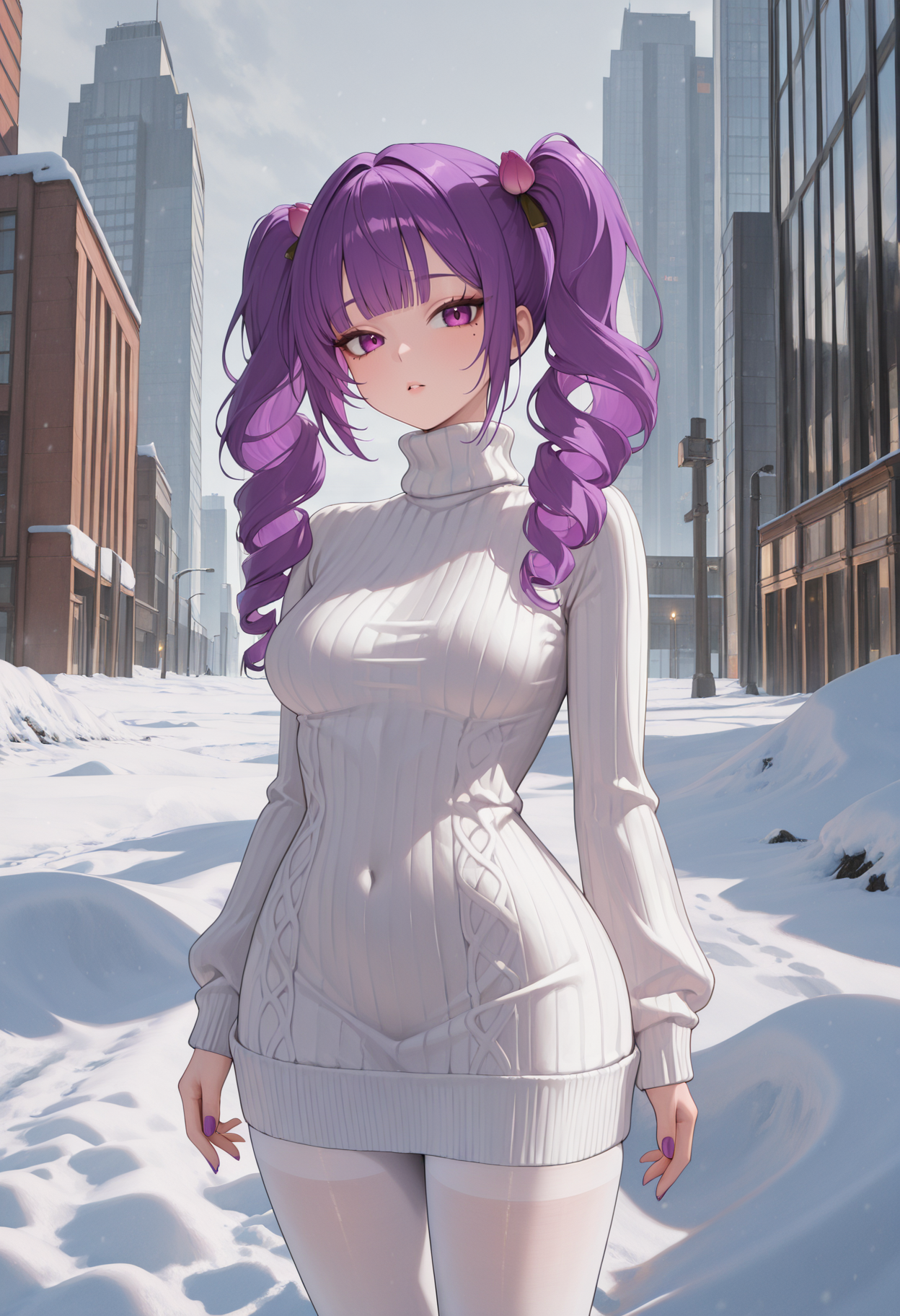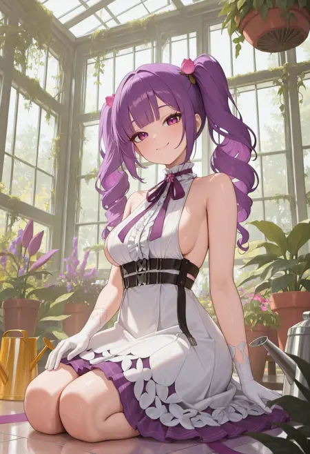 flra, 보라색 눈, 눈 밑 점, 보라색 머리카락, 트윈테일, 드릴 헤어, 드릴 머리, 둔한 앞머리, 옆머리, 긴 머리카락, 머리 장식, 중간 크기 가슴, 목 리본, 보라색 리본, 프릴, 흰색 드레스, 소매 없는 드레스, 중앙 프릴, 벨트, 흰색 장갑