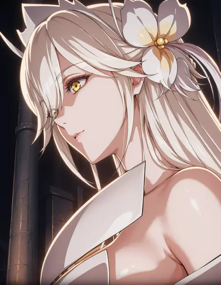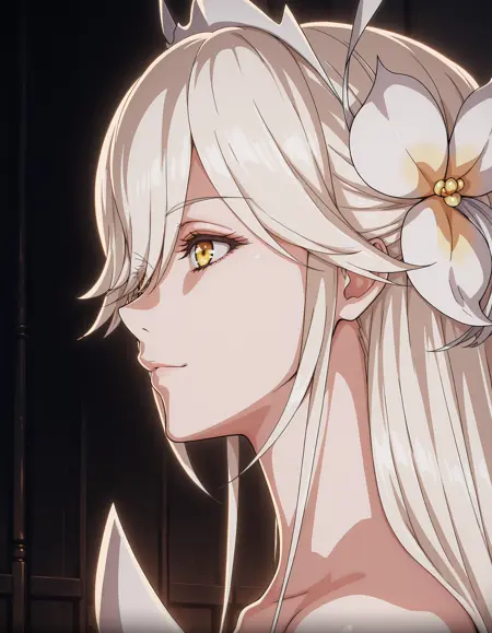 goddess_vicius, 1girl, solo, hair ornament, yellow eyes, breasts, flower