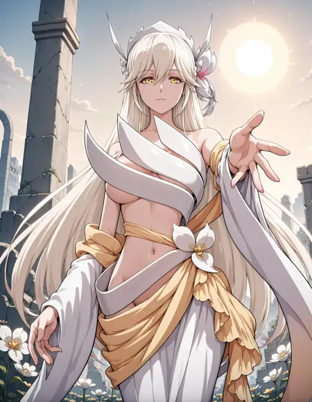 goddess_vicius, 1girl, solo, hair ornament, yellow eyes, breasts, flower, groin