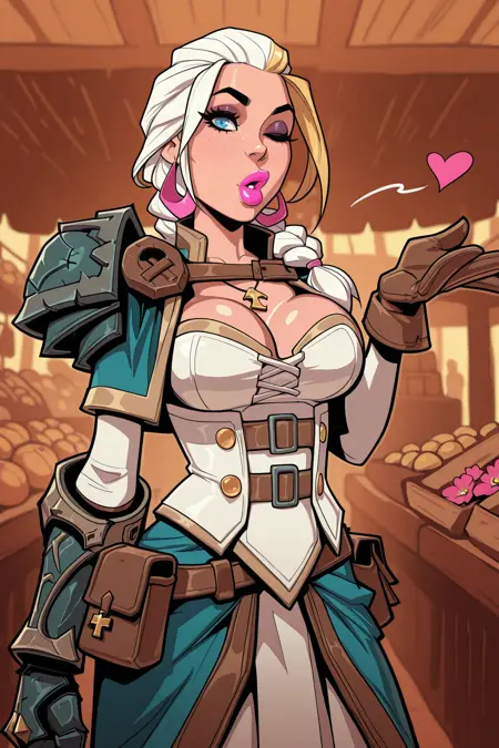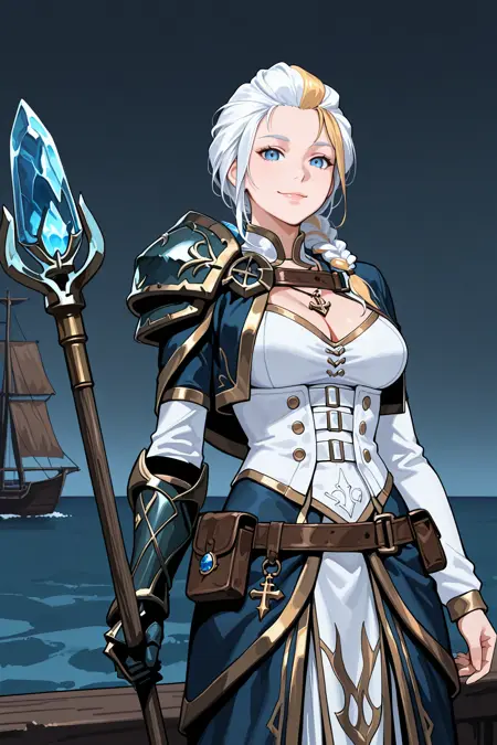 트리거 BfA : jainaP, 이색 머리카락, 흰머리, 긴 앞머리, 땋은 머리, 파란 눈, 카펠릿, 한쪽 어깨 방어구, 가슴 벨트, 배선 모양 목걸이, 베스트, 십자형 끈 매듭, 셔츠, 흉부 노출, 코셋, 긴 소매, 한쪽 장갑, 장갑, 벨트, 벨트 장신구, 벨트 주머니, 허리 망토, 긴 치마, 끈 신발