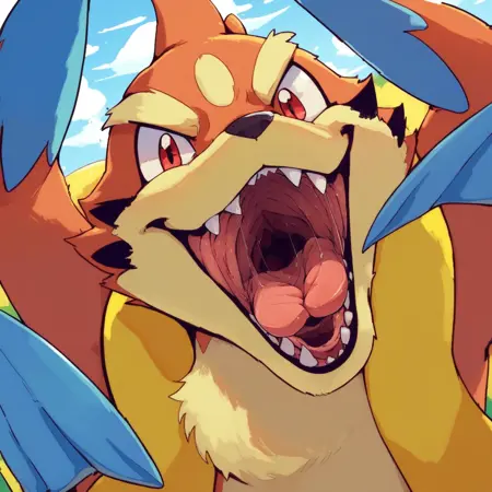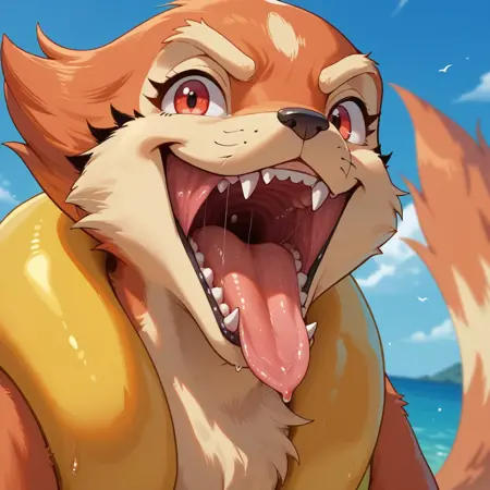 weasel, orange fur, blue fins, Multiple tails, two tails, yellow tube,