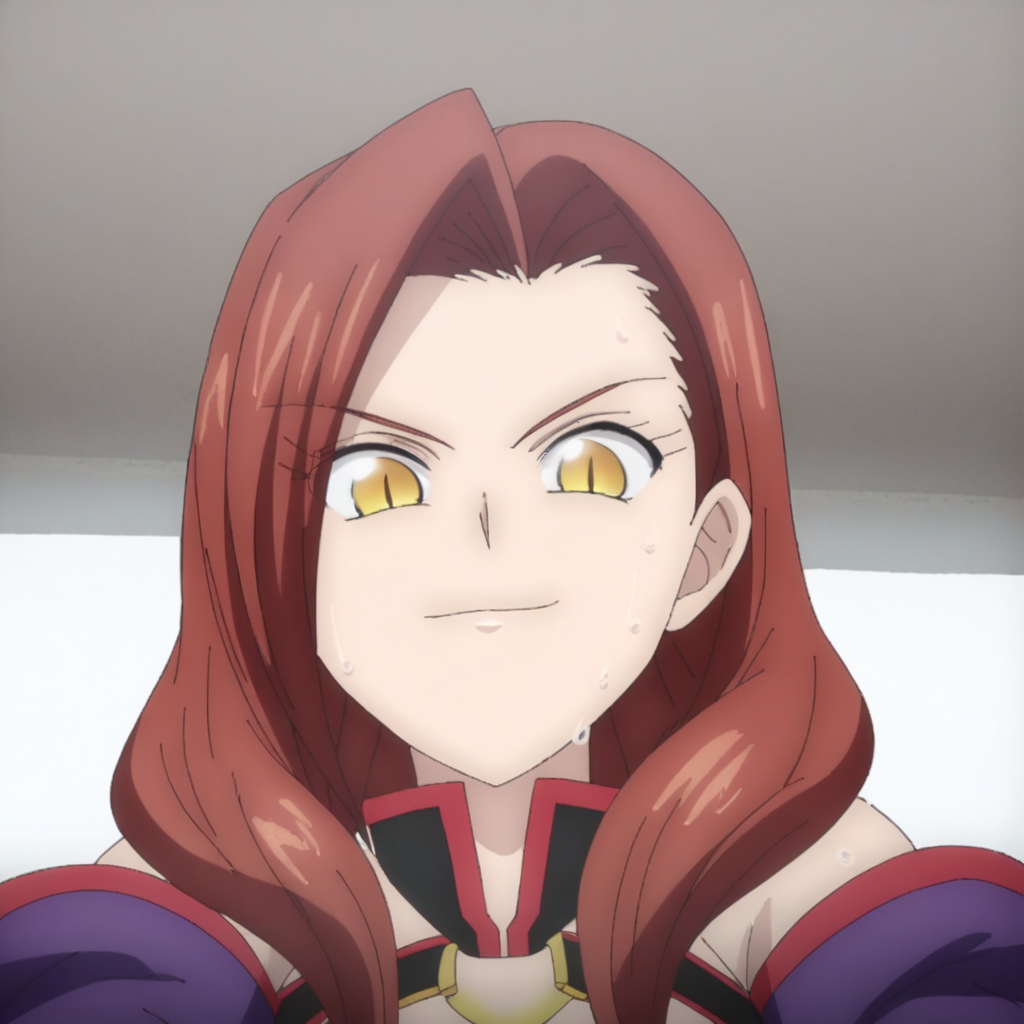 source_anime, Sheila_옷, Sheila_머리, 노란 눈, 가슴 선명, 큰 가슴, 미소, 시청자 바라봄, 카우보이 샷, 어깨 노출