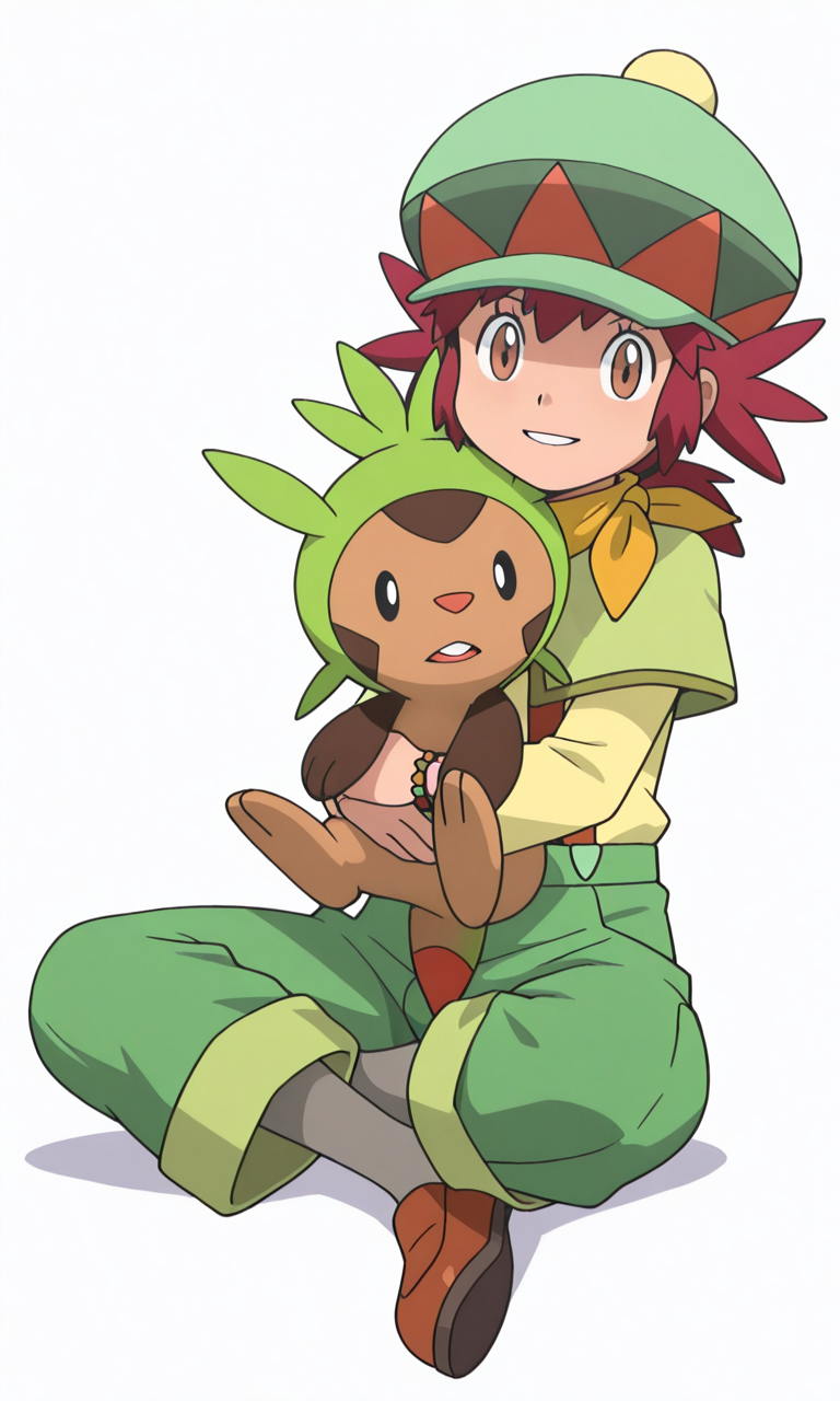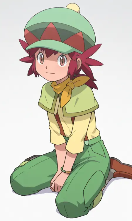 기본 태그: Mairin, 1girl, brown eyes, red hair, medium hair, ponytail, hat, yellow scarf, green shawl, green shirt, brown suspenders, green pants, grey socks, brown shoes, orange backpack, bracelet,