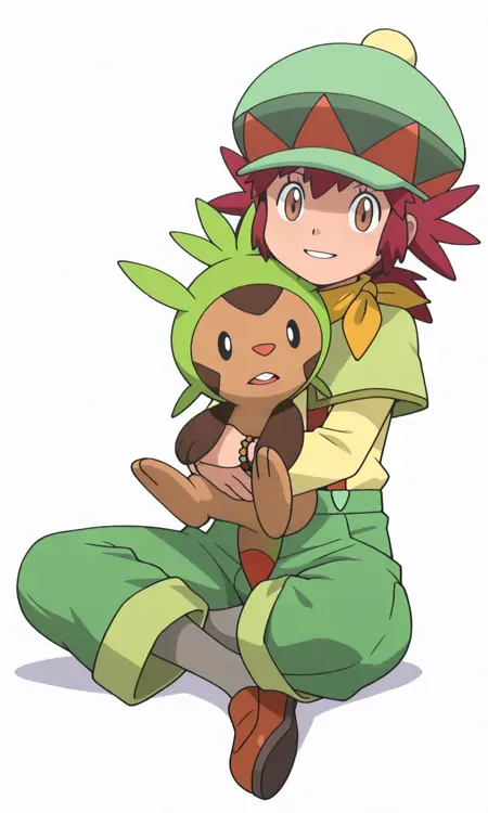 默认标签: Mairin, 1girl, brown eyes, red hair, medium hair, ponytail, hat, yellow scarf, green shawl, green shirt, brown suspenders, green pants, grey socks, brown shoes, orange backpack, bracelet,
