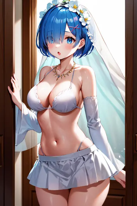 아웃핏3 (웨딩 비키니)aarem, 단발, 헤어 꽃, 결혼식 베일, x 헤어 장식, 한쪽 눈에 머리카락 덮임, 큰 가슴, 목걸이, 쇄골, 흉부 노출, 흰색 브라, 분리된 소매, 흰색 스커트, 미니스커트, 허벅지 간격
