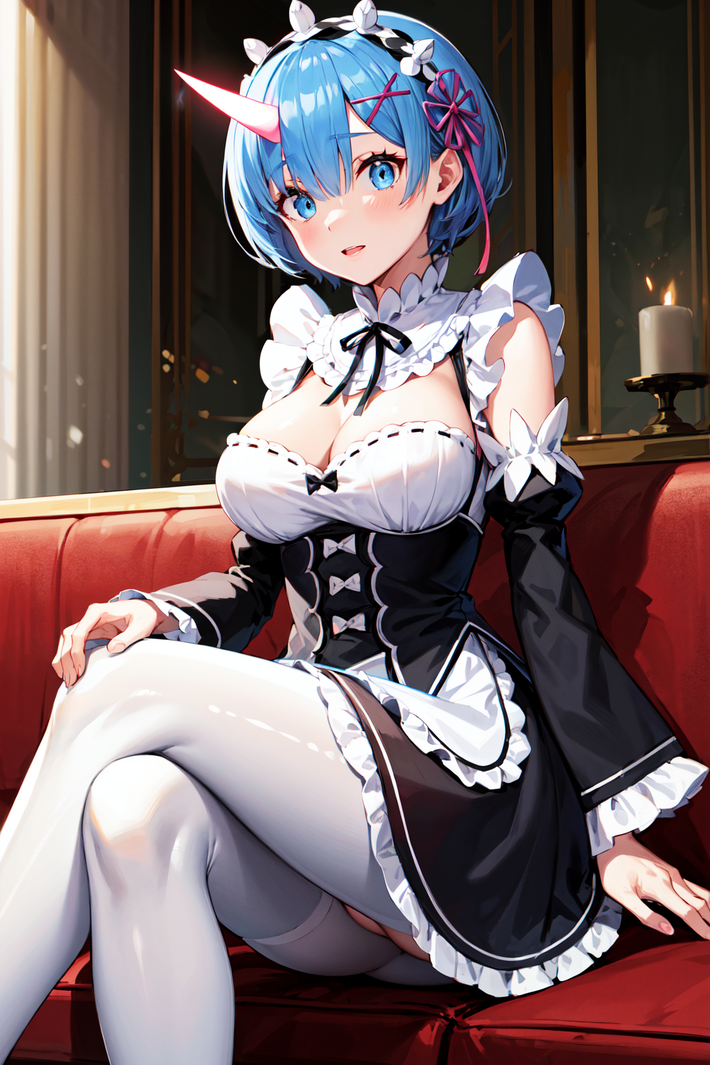 아웃핏1 (오니 뿔)aarem, 단발, 메이드 헤드장식, x 헤어 장식, 헤어 리본, 단일 뿔, 빛나는 뿔, 한쪽 눈에 머리카락 덮임, 큰 가슴, 프릴, 목 리본, 흉부 노출, 드레스, 분리된 소매, 흰색 앞치마, 허리 앞치마, 흰색 팬티혼즈