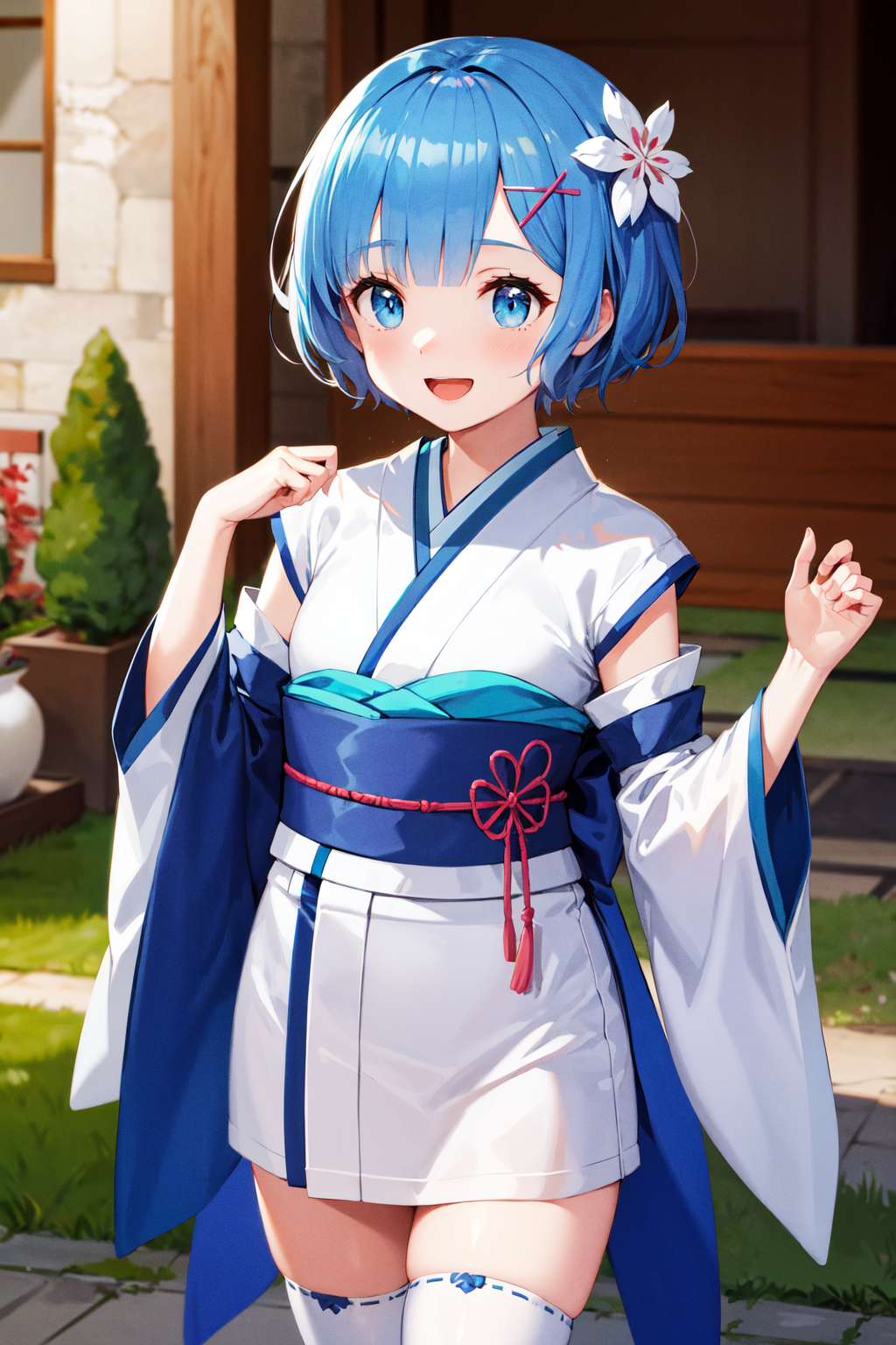 아웃핏2 (젊은 버전)bbrem, 단발, x 헤어 장식, 일본 복장, 흰색 키모노, 짧은 키모노, 분리된 소매, 넓은 소매, 띠, 흰색 히프하이즈, 어린 외모