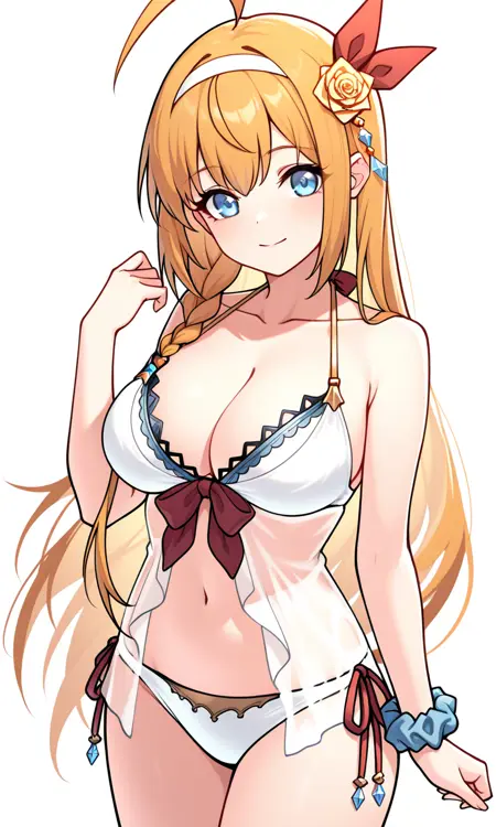 여름 옷차림: pecorinesummerPCRD, 긴 머리, 머리 장식, 리본, 배꼽, 가슴 라인, 어깨 노출, 잠금뼈, 수영복, 머리 리본, ahoge, 머리 꽃, 빨간 리본, 투명, 팔 노출, 사이드 티 언더웨어, 흰 비키니, 사이드 땋은 머리, 흰 머리띠, 노란 꽃, 손목 스러ン치, 노란 장미,