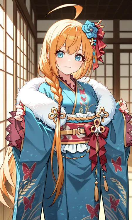 하레기 옷차림: pecorineharegePCRD, 긴 머리, 머리 장식, 긴 소매, 리본, 매우 긴 머리, 의자 리본, ahoge, 머리 꽃, 넓은 소매, 손톱 매니큐어, 빨간 리본, 띠, 단일 땋은 머리, 오비, 동물 무늬, 사이드 땋은 머리, 파란 꽃, 파란 키모노, 나비 무늬,