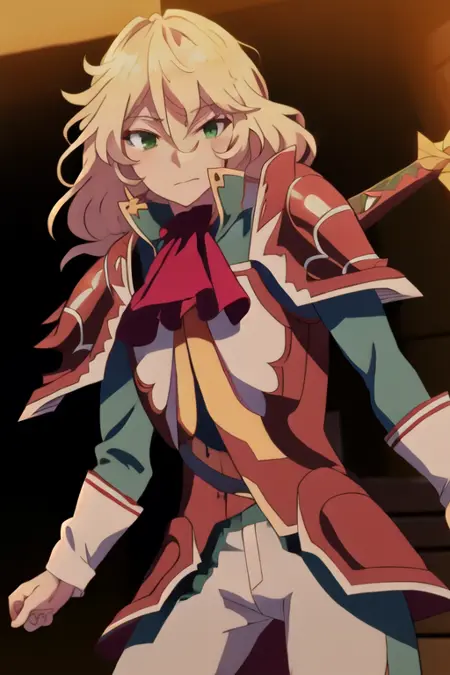 服装1:男性焦点,单人,长袖,武器,剑,盔甲,领结,肩甲,护肩,红色领结,武器背在背后