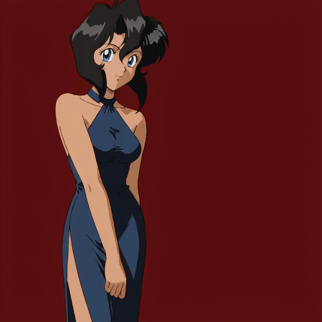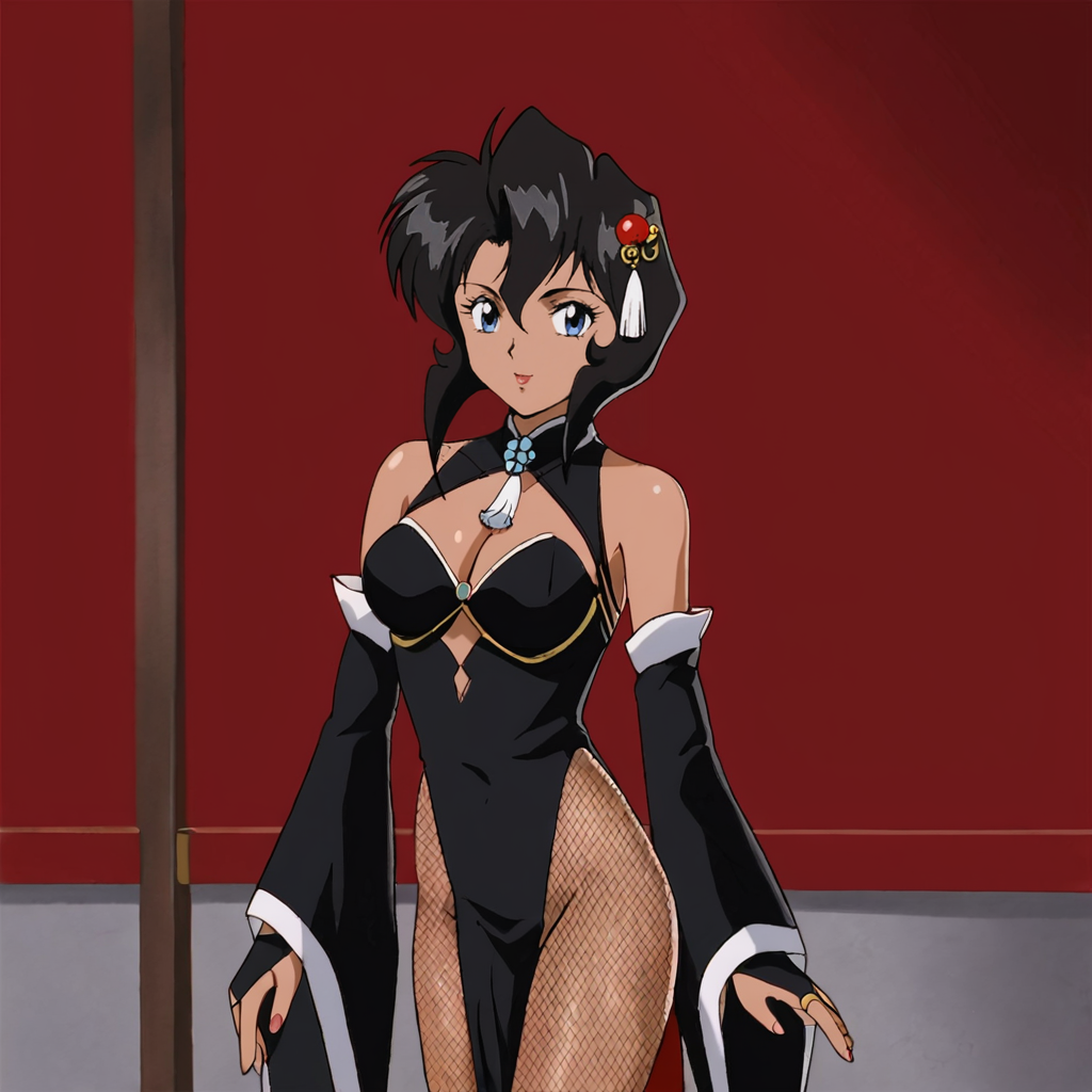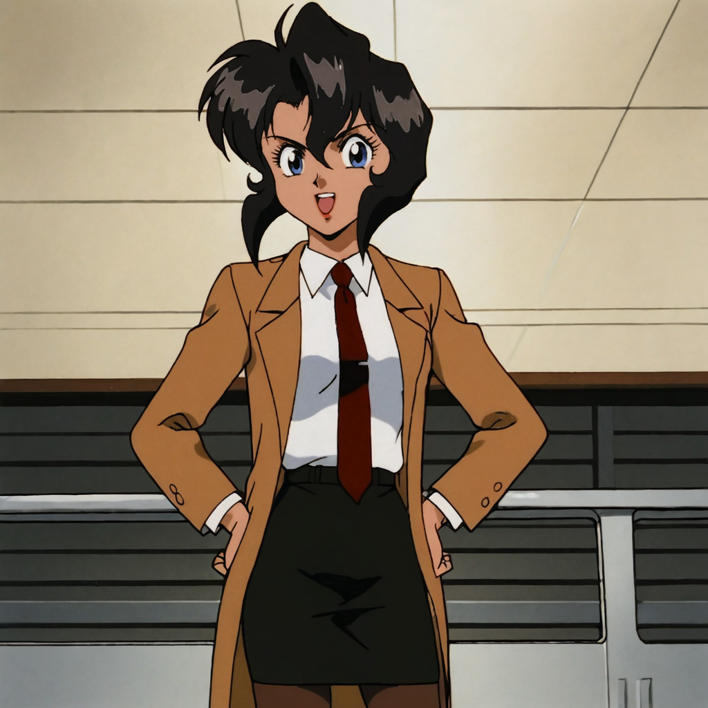 触发词:Rally, jacket, 1girl, red necktie, pantyhose, blue eyes, coat, dark skin, pencil skirt, black hair, retro artstyle, dark-skinned female, 1990s (style), short hair, shirt, cowboy shot, hands on hips