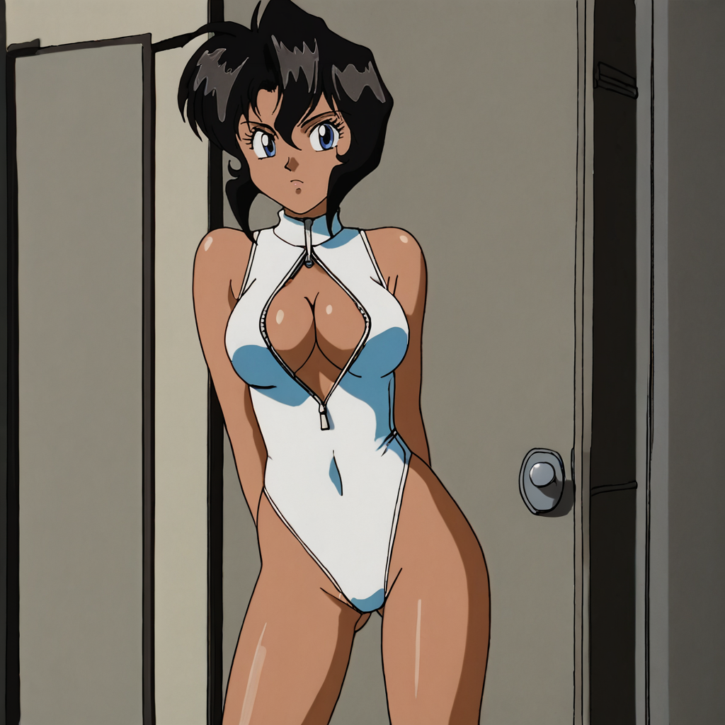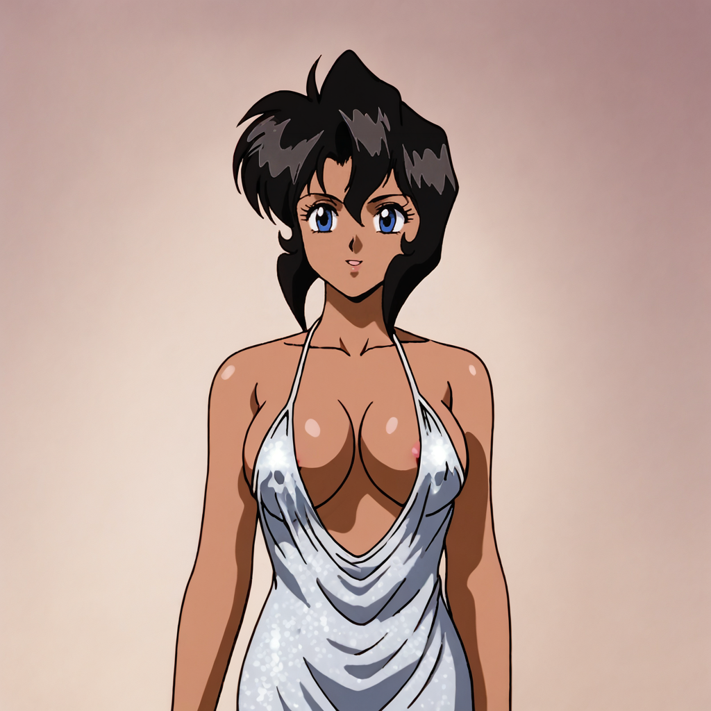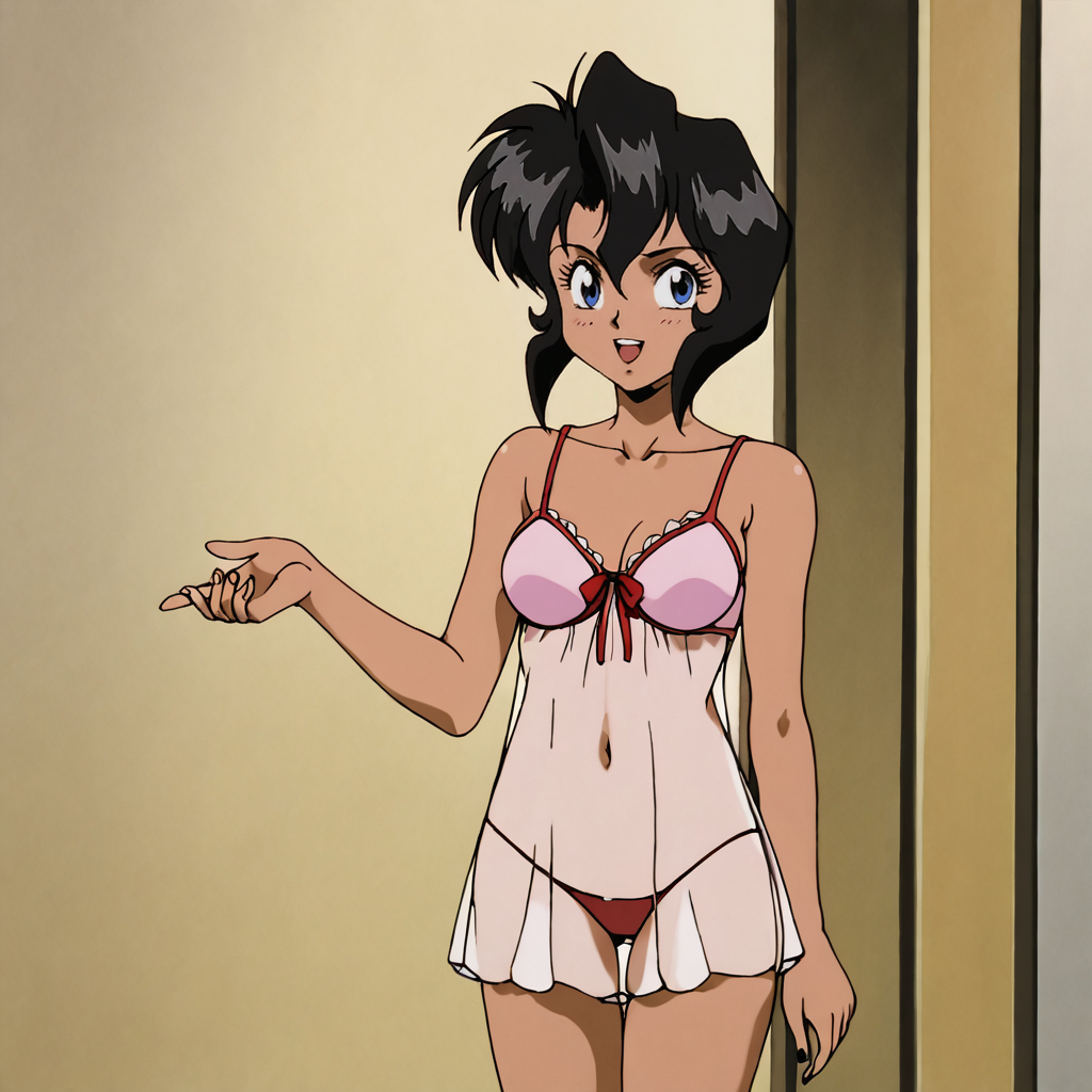 触发词:Rally, jacket, 1girl, red necktie, pantyhose, blue eyes, coat, dark skin, pencil skirt, black hair, retro artstyle, dark-skinned female, 1990s (style), short hair, shirt, cowboy shot, hands on hips