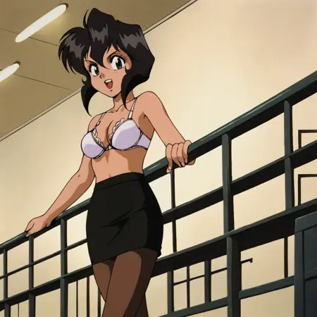 带胸罩的触发词:RallyBra, 1girl, underwear, 1990s (style), retro artstyle, white bra, black hair, pencil skirt, short hair, pantyhose, medium breasts, dark skin, lingerie, black eyes, dark-skinned female, ceiling light, black skirt, cleavage