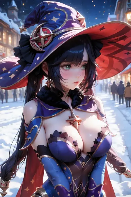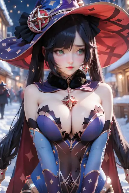 witch hat,twintails,black hair,long hair,detached sleeves,star earrings,jewelry,bare shoulders,green eyes,strapless leotard,blue headwear,black gloves,cape,elbow gloves