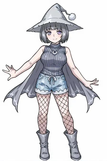 セット1:ポンポン付き魔女帽、フィッシュネットのレッグウェア、ノースリーブのタートルネック、キャップ、セーター、青いショートショーツ、ネックレス、ペンダント、ブーツ